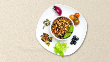 Caponata is a sweet-and-sour vegetable dish served at room temperature. The aromas of the several ingredients really come into their own thanks to the soft acidity of the red wine vinegar... more